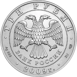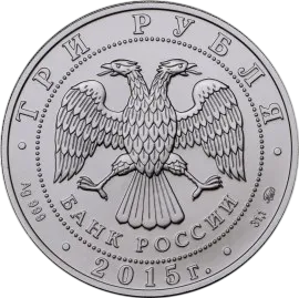 Аверс на монетах по 2015г. включительно: в центре — эмблема Банка России (двуглавый орёл с опущенными крыльями, под ним — надпись полукругом «БАНК РОССИИ»), обрамленная кругом из точек и надписями по кругу — вверху: «ТРИ РУБЛЯ», внизу: слева — обозначения драгоценного металла и пробы сплава, в центре — дата выпуска, справа — содержание химически чистого металла и товарный знак монетного двора.