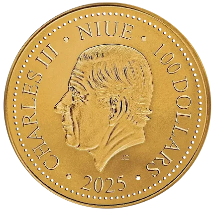 На аверсе монеты на матовом фоне глянцево изображен портрет короля Карла III, номинальная стоимость монеты — 100 новозеландских долларов и год выпуска.