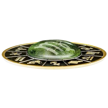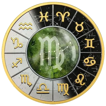 На реверсе монеты изображен символ и созвездие Девы под увеличительным стеклом. Вокруг 12 символов знаков Зодиака и их созвездий.