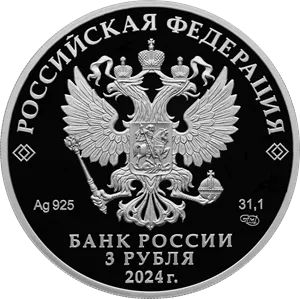 Аверс: рельефное изображение Государственного герба Российской Федерации, над ним вдоль канта – надпись полукругом «РОССИЙСКАЯ ФЕДЕРАЦИЯ», обрамленная с обеих сторон сдвоенными ромбами, под гербом слева – обозначения драгоценного металла и пробы сплава, справа – содержание химически чистого металла и товарный знак монетного двора, внизу в центре в три строки – надпись «БАНК РОССИИ», номинал монеты «3 РУБЛЯ», год выпуска «2024 г.».