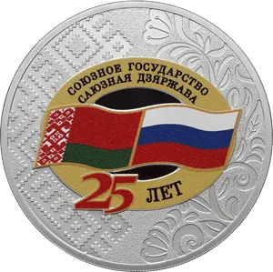 Реверс: цветное изображение символики, посвященной 25-летию со дня подписания договора о создании Союзного государства, на фоне рельефной композиции из белорусского и русского орнаментов.