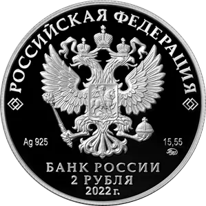 Аверс: рельефное изображение Государственного герба Российской Федерации, над ним вдоль канта – надпись полукругом: «РОССИЙСКАЯ ФЕДЕРАЦИЯ», обрамленная с обеих сторон сдвоенными ромбами, под гербом: слева – обозначения драгоценного металла и пробы сплава, справа – содержание химически чистого металла и товарный знак монетного двора, внизу в центре в три строки – надпись: «БАНК РОССИИ», номинал монеты: «2 РУБЛЯ», год выпуска: «2022 г.».
