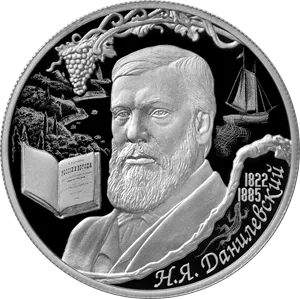 Реверс: рельефные изображения портрета Н.Я. Данилевского, раскрытой книги и виноградной лозы и выполненные в технике лазерного матирования изображения южного берега Крыма, рыболовецкой шхуны и ящерицы; в обрамлении рельефного изображения морской пены расположены выполненные в рельефе надпись: «Н.Я. ДАНИЛЕВСКИЙ» и годы жизни в две строки: «1822», «1885».